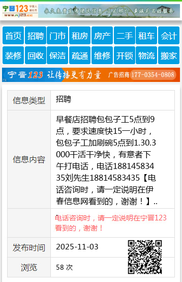 早餐店招聘包包子工5点到9点,要求速度快15一小时,包包子工加刷碗5点到1.30.3000干活干净快,有意者下午打电话,电话18814583435刘先生18814583435 【电话咨询时,请一定说明在伊春信息网看到的,谢谢!】 |