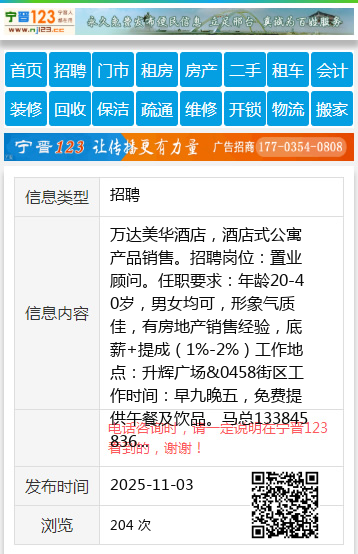 万达美华酒店,酒店式公寓产品销售。招聘岗位:置业顾问。任职要求:年龄20-40岁,男女均可,形象气质佳,有房地产销售经验,底薪+提成(1%-2%)工作地点:升辉广场&0458街区工作时间:早九晚五,免费提供午餐及饮品。马总13384583658 【电话咨询时,请一定说明在伊春信息网看到的,谢谢!】 |