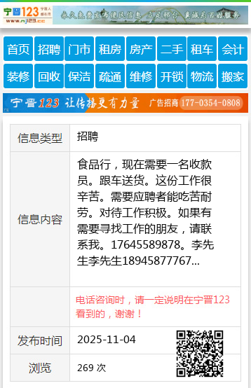 食品行,现在需要一名收款员。跟车送货。这份工作很辛苦。需要应聘者能吃苦耐劳。对待工作积极。如果有需要寻找工作的朋友,请联系我。17645589878。李先生李先生18945877767 【电话咨询时,请一定说明在伊春信息网看到的,谢谢!】 |