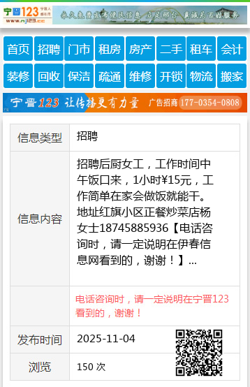 招聘后厨女工,工作时间中午饭口来,1小时¥15元,工作简单在家会做饭就能干。地址红旗小区正餐炒菜店杨女士18745885936 【电话咨询时,请一定说明在伊春信息网看到的,谢谢!】 |