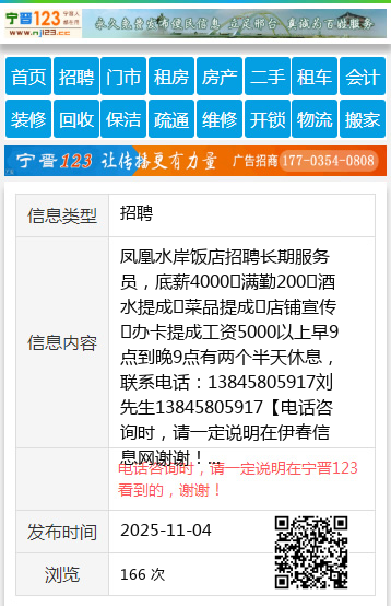 凤凰水岸饭店招聘长期服务员,底薪4000➕满勤200➕酒水提成➕菜品提成➕店铺宣传➕办卡提成工资5000以上早9点到晚9点有两个半天休息,联系电话:13845805917刘先生13845805917 【电话咨询时,请一定说明在伊春信息网看到的,谢谢!】 |