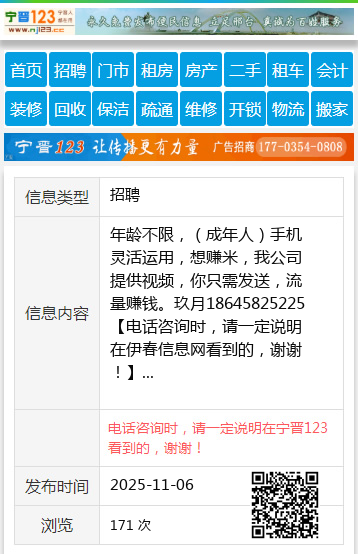 年龄不限,(成年人)手机灵活运用,想赚米,我公司提供视频,你只需发送,流量赚钱。玖月18645825225