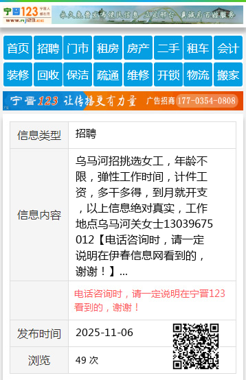 乌马河招挑选女工,年龄不限,弹性工作时间,计件工资,多干多得,到月就开支,以上信息绝对真实,工作地点乌马河关女士13039675012 【电话咨询时,请一定说明在伊春信息网看到的,谢谢!】 |