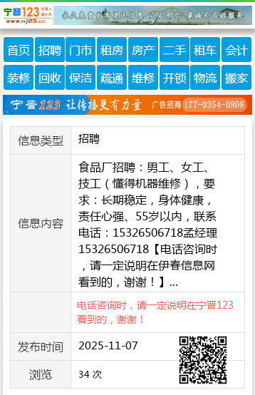 食品厂招聘:男工、女工、技工(懂得机器维修),要求:长期稳定,身体健康,责任心强、55岁以内,联系电话:15326506718孟经理15326506718 【电话咨询时,请一定说明在伊春信息网看到的,谢谢!】 |