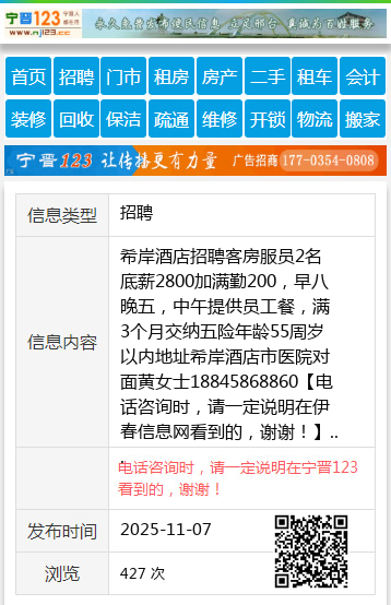 希岸酒店招聘客房服员2名底薪2800加满勤200,早八晚五,中午提供员工餐,满3个月交纳五险年龄55周岁以内地址希岸酒店市医院对面黄女士18845868860 【电话咨询时,请一定说明在伊春信息网看到的,谢谢!】 |