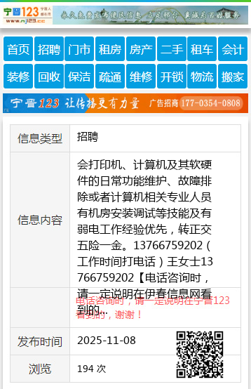 会打印机、计算机及其软硬件的日常功能维护、故障排除或者计算机相关专业人员有机房安装调试等技能及有弱电工作经验优先,转正交五险一金。13766759202(工作时间打电话)王女士13766759202 【电话咨询时,请一定说明在伊春信息网看到的,谢谢!】 |