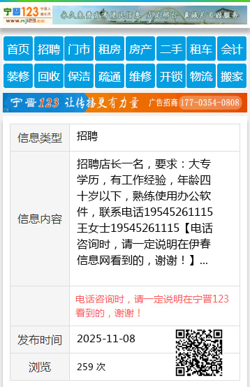 招聘店长一名,要求:大专学历,有工作经验,年龄四十岁以下,熟练使用办公软件,联系电话19545261115王女士19545261115 【电话咨询时,请一定说明在伊春信息网看到的,谢谢!】 |