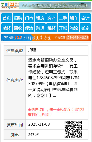 酒水商贸招聘办公室文员,要求会用进销存软件,有工作经验,短期工勿扰,联系电话17845087999梁志17845087999 【电话咨询时,请一定说明在伊春信息网看到的,谢谢!】 |
