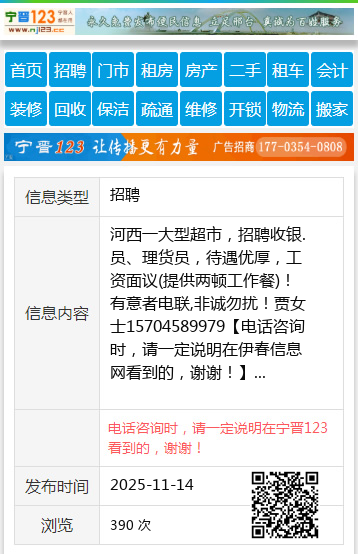 河西一大型超市,招聘收银.员、理货员,待遇优厚,工资面议(提供两顿工作餐)!有意者电联,非诚勿扰!贾女士15704589979 【电话咨询时,请一定说明在伊春信息网看到的,谢谢!】 |