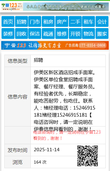 伊美区新区酒店招成手面案。伊美区单位食堂招聘成手面案、餐厅经理、餐厅服务员。有经验者优先,长期稳定,能吃苦耐劳,包吃住。联系人:褚经理电话:15246915181褚经理15246915181 【电话咨询时,请一定说明在伊春信息网看到的,谢谢!】 |