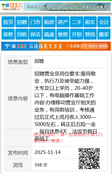 招聘营业员岗位要求:爱岗敬业,执行力及接受能力强,大专及以上学历,20-40岁以下,有电脑操作基础工作内容:办理移动营业厅相关的业务,有岗前培训,考核通过后正式上岗月收入3000—5000左右,转正后五险一金,每月休息4天,法定节假日双倍工资!办公地址:伊春市区内邮电大厦旁边移动营业厅(市医院对面)电话:13766733307张女士13766733307 【电话咨询时,请一定说明在伊春信息网看到的,谢谢!】 |