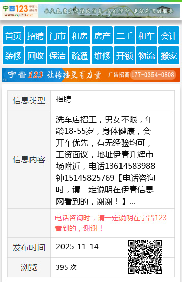 洗车店招工,男女不限,年龄18-55岁,身体健康,会开车优先,有无经验均可,工资面议,地址伊春升辉市场附近,电话13614583988钟15145825769 【电话咨询时,请一定说明在伊春信息网看到的,谢谢!】 |