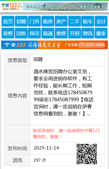 酒水商贸招聘办公室文员,要求会用进销存软件,有工作经验,能长期工作,短期勿扰,联系电话17845087999梁志17845087999 【电话咨询时,请一定说明在伊春信息网看到的,谢谢!】 |