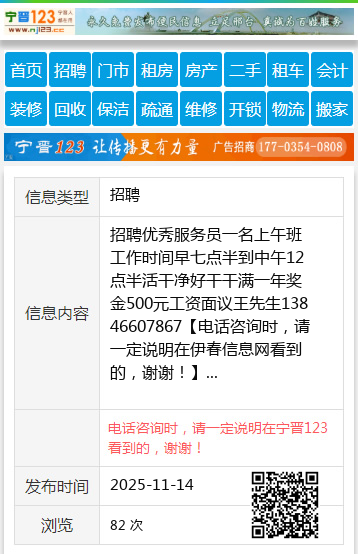 招聘优秀服务员一名上午班工作时间早七点半到中午12点半活干净好干干满一年奖金500元工资面议王先生13846607867
