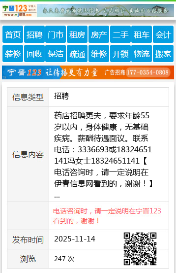 药店招聘更夫,要求年龄55岁以内,身体健康,无基础疾病。薪酬待遇面议。联系电话:3336693或18324651141冯女士18324651141 【电话咨询时,请一定说明在伊春信息网看到的,谢谢!】 |