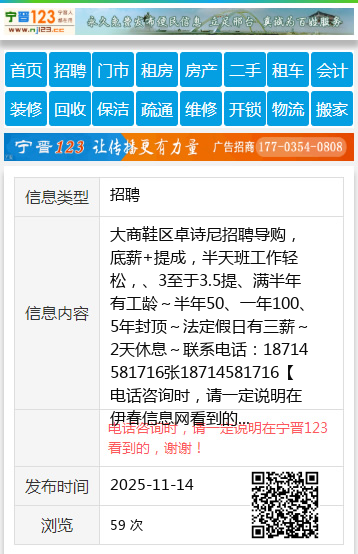 大商鞋区卓诗尼招聘导购,底薪+提成,半天班工作轻松,、3至于3.5提、满半年有工龄~半年50、一年100、5年封顶~法定假日有三薪~2天休息~联系电话:18714581716张18714581716 【电话咨询时,请一定说明在伊春信息网看到的,谢谢!】 |