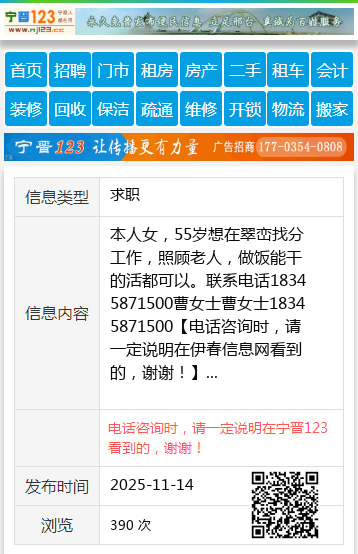 本人女,55岁想在翠峦找分工作,照顾老人,做饭能干的活都可以。联系电话18345871500曹女士曹女士18345871500 【电话咨询时,请一定说明在伊春信息网看到的,谢谢!】 |