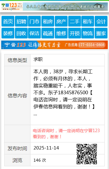 本人男,38岁,寻求长期工作,必须有月休的,本人,踏实稳重能干,人老实,事不多。东子18345876500