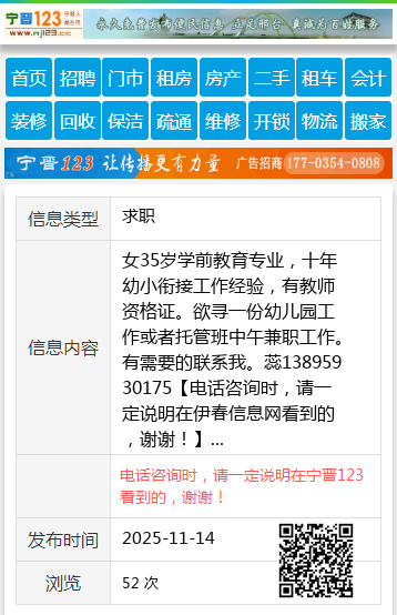 女35岁学前教育专业,十年幼小衔接工作经验,有教师资格证。欲寻一份幼儿园工作或者托管班中午兼职工作。有需要的联系我。蕊13895930175 【电话咨询时,请一定说明在伊春信息网看到的,谢谢!】 |