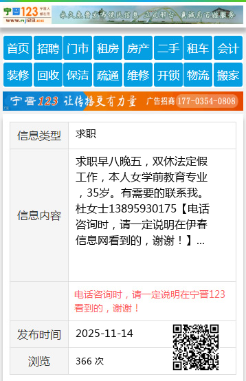 求职早八晚五,双休法定假工作,本人女学前教育专业,35岁。有需要的联系我。杜女士13895930175