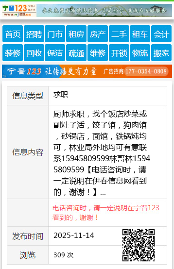 厨师求职,找个饭店炒菜或副灶子活,饺子馆,狗肉馆,砂锅店,面馆,铁锅炖均可,林业局外地均可有意联系15945809599林哥林15945809599 【电话咨询时,请一定说明在伊春信息网看到的,谢谢!】 |