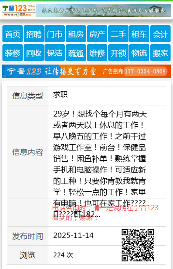 29岁!想找个每个月有两天或者两天以上休息的工作!早八晚五的工作!之前干过游戏工作室!前台!保健品销售!闲鱼补单!熟练掌握手机和电脑操作!可适应新的工种!只要你肯教我就肯学!轻松一点的工作!家里有电脑!也可在家工作????????韩18249805833 【电话咨询时,请一定说明在伊春信息网看到的,谢谢!】 |