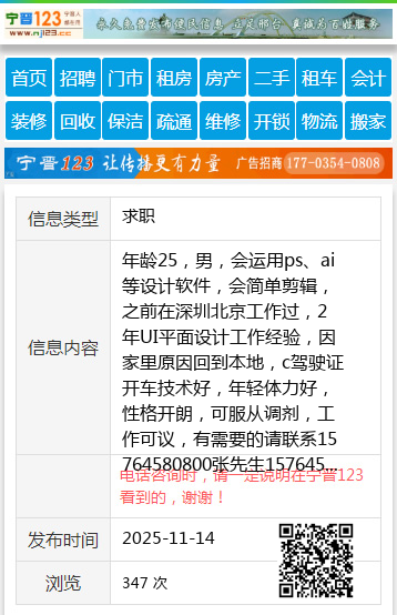 年龄25,男,会运用ps、ai等设计软件,会简单剪辑,之前在深圳北京工作过,2年UI平面设计工作经验,因家里原因回到本地,c驾驶证开车技术好,年轻体力好,性格开朗,可服从调剂,工作可议,有需要的请联系15764580800张先生15764580800 【电话咨询时,请一定说明在伊春信息网看到的,谢谢!】 |