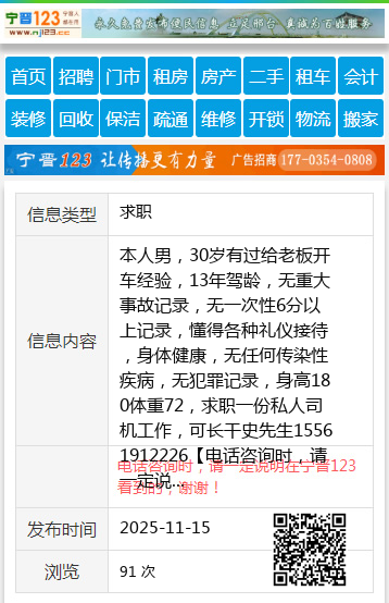 本人男,30岁有过给老板开车经验,13年驾龄,无重大事故记录,无一次性6分以上记录,懂得各种礼仪接待,身体健康,无任何传染性疾病,无犯罪记录,身高180体重72,求职一份私人司机工作,可长干史先生15561912226 【电话咨询时,请一定说明在伊春信息网看到的,谢谢!】 |
