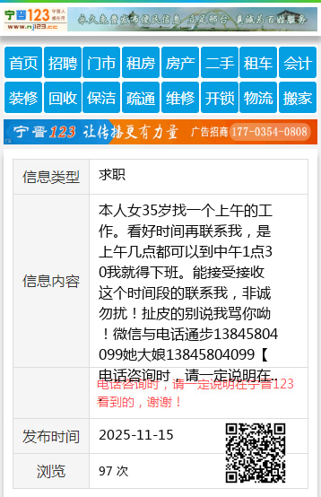 本人女35岁找一个上午的工作。看好时间再联系我,是上午几点都可以到中午1点30我就得下班。能接受接收这个时间段的联系我,非诚勿扰!扯皮的别说我骂你呦!微信与电话通步13845804099她大娘13845804099 【电话咨询时,请一定说明在伊春信息网看到的,谢谢!】 |