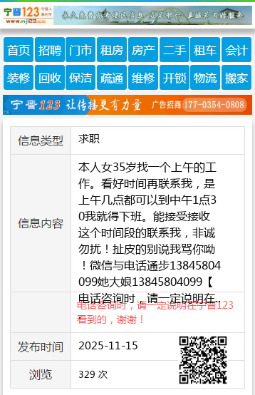 本人女35岁找一个上午的工作。看好时间再联系我,是上午几点都可以到中午1点30我就得下班。能接受接收这个时间段的联系我,非诚勿扰!扯皮的别说我骂你呦!微信与电话通步13845804099她大娘13845804099 【电话咨询时,请一定说明在伊春信息网看到的,谢谢!】 |