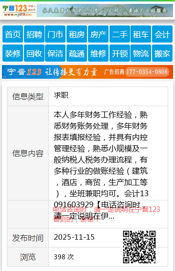 本人多年财务工作经验,熟悉财务账务处理,多年财务报表填报经验,并具有内控管理经验,熟悉小规模及一般纳税人税务办理流程,有多种行业的做账经验(建筑,酒店,商贸,生产加工等),坐班兼职均可。会计13091603929 【电话咨询时,请一定说明在伊春信息网看到的,谢谢!】 |