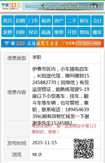 伊春市区内,小车搭电启车,长短途代驾,随叫随到15245882770(同微信)有货运资格证,能熟练驾驶5-19座以下小型客车,挂车,翻斗车等车辆,也可替班,兼职,联系电话:18945463939长期有效帮忙转发一下谢谢李先生15245882770 【电话咨询时,请一定说明在伊春信息网看到的,谢谢!】 |