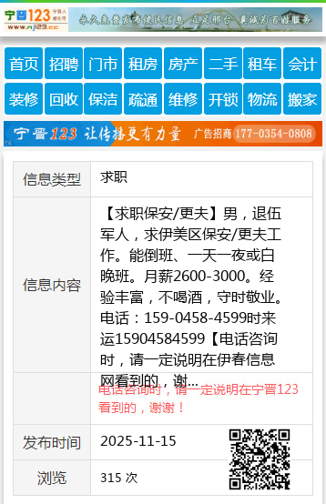 【求职保安/更夫】男,退伍军人,求伊美区保安/更夫工作。能倒班、一天一夜或白晚班。月薪2600-3000。经验丰富,不喝酒,守时敬业。电话:159-0458-4599时来运15904584599 【电话咨询时,请一定说明在伊春信息网看到的,谢谢!】 |