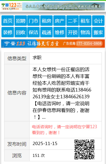 本人女想找一份正餐店的活想找一份刷碗的本人有丰富经验本人吃苦耐劳踏实肯干如有想用的联系电话13846626139金女士13846626139 【电话咨询时,请一定说明在伊春信息网看到的,谢谢!】 |