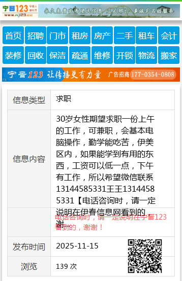 30岁女性期望求职一份上午的工作,可兼职,会基本电脑操作,勤学能吃苦,伊美区内,如果能学到有用的东西,工资可以低一点,下午有工作,所以希望微信联系13144585331王王13144585331 【电话咨询时,请一定说明在伊春信息网看到的,谢谢!】 |