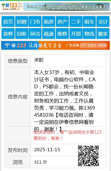 本人女37岁,有初、中级会计证书,电脑办公软件,CAD,PS都会,找一份长期稳定的工作,出纳或者文员,财务相关的工作,工作认真负责,学习能力强。陈13694581036 【电话咨询时,请一定说明在伊春信息网看到的,谢谢!】 |
