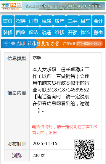 本人女求职一份长期稳定工作(以前一直做销售)会使用电脑文员行政类似于的行业可联系18718714589552