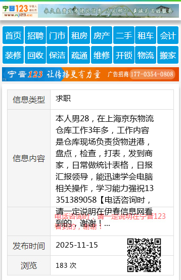 本人男28,在上海京东物流仓库工作3年多,工作内容是仓库现场负责货物进港,盘点,检查,打表,发到商家,日常做统计表格,日报汇报领导,能迅速学会电脑相关操作,学习能力强祝13351389058 【电话咨询时,请一定说明在伊春信息网看到的,谢谢!】 |