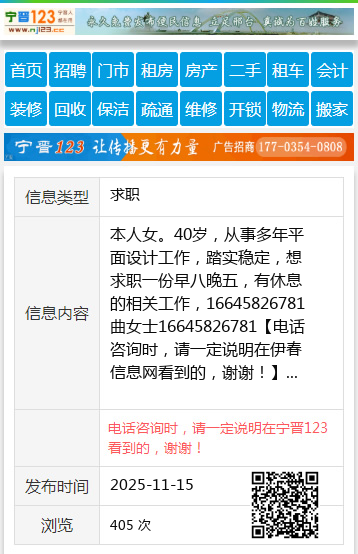 本人女。40岁,从事多年平面设计工作,踏实稳定,想求职一份早八晚五,有休息的相关工作,16645826781曲女士16645826781 【电话咨询时,请一定说明在伊春信息网看到的,谢谢!】 |