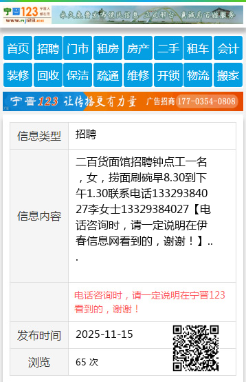 二百货面馆招聘钟点工一名,女,捞面刷碗早8.30到下午1.30联系电话13329384027李女士13329384027