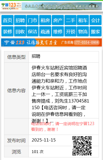 伊春火车站附近宾馆招聘酒店前台一名要求有良好的沟通能力和亲和力,工作地点伊春火车站附近,工作时间上一休一,工资底薪三千加售房提成,刘先生13704581150 【电话咨询时,请一定说明在伊春信息网看到的,谢谢!】 |
