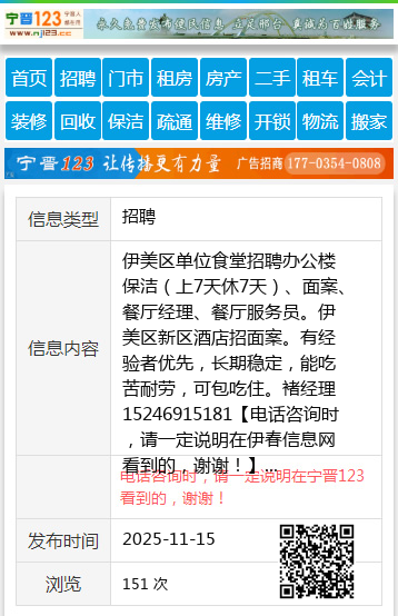 伊美区单位食堂招聘办公楼保洁(上7天休7天)、面案、餐厅经理、餐厅服务员。伊美区新区酒店招面案。有经验者优先,长期稳定,能吃苦耐劳,可包吃住。褚经理15246915181 【电话咨询时,请一定说明在伊春信息网看到的,谢谢!】 |