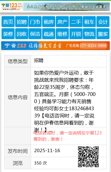 如果你热爱户外运动,敢于挑战就来找我招聘要求:年龄22至35周岁,体态匀称,五官端正。月薪(5000-7000)具备学习能力有无销售经验均可彭女士18324684339 【电话咨询时,请一定说明在伊春信息网看到的,谢谢!】 |