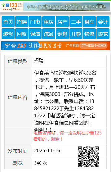 伊春菜鸟快递招聘快递员2名,提供三轮车,早6:30送完下班,月上班15—20天左右,保底3000+部分提成。地址:七公里。联系电话:13845821222于先生13845821222 【电话咨询时,请一定说明在伊春信息网看到的,谢谢!】 |