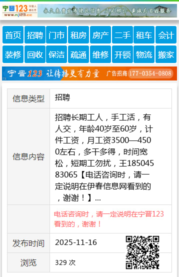 招聘长期工人,手工活,有人交,年龄40岁至60岁,计件工资,月工资3500—4500左右,多干多得,时间宽松,短期工勿扰,王18504583065 【电话咨询时,请一定说明在伊春信息网看到的,谢谢!】 |
