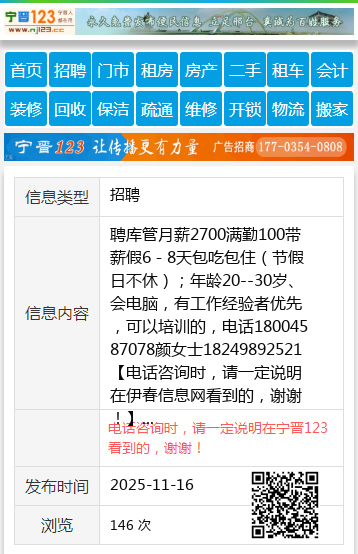 聘库管月薪2700满勤100带薪假6-8天包吃包住(节假日不休);年龄20--30岁、会电脑,有工作经验者优先,可以培训的,电话18004587078颜女士18249892521 【电话咨询时,请一定说明在伊春信息网看到的,谢谢!】 |