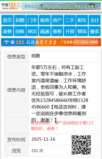 年薪5万左右,另有工龄工资。常年不接触凉水,工作室内温度温暖,工作环境舒适,老板同事为人和善。有无经验皆可,能长期工作者优先13284586660辛刚13284586660 【电话咨询时,请一定说明在伊春信息网看到的,谢谢!】 |
