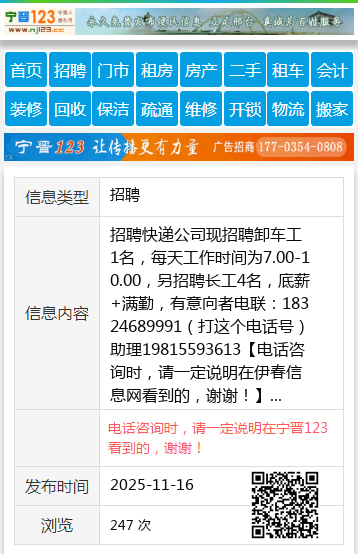 招聘快递公司现招聘卸车工1名,每天工作时间为7.00-10.00,另招聘长工4名,底薪+满勤,有意向者电联:18324689991(打这个电话号)助理19815593613 【电话咨询时,请一定说明在伊春信息网看到的,谢谢!】 |