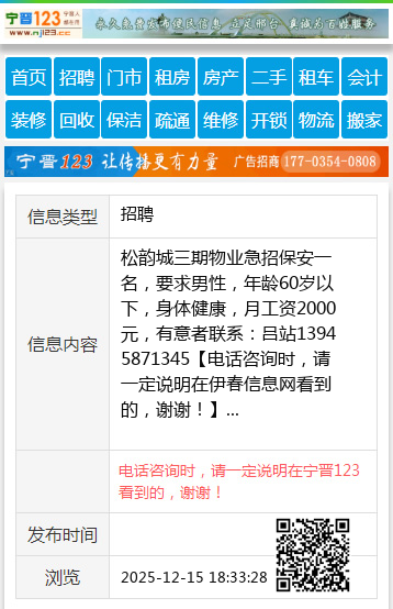 松韵城三期物业急招保安一名,要求男性,年龄60岁以下,身体健康,月工资2000元,有意者联系:吕站13945871345 【电话咨询时,请一定说明在伊春信息网看到的,谢谢!】 |