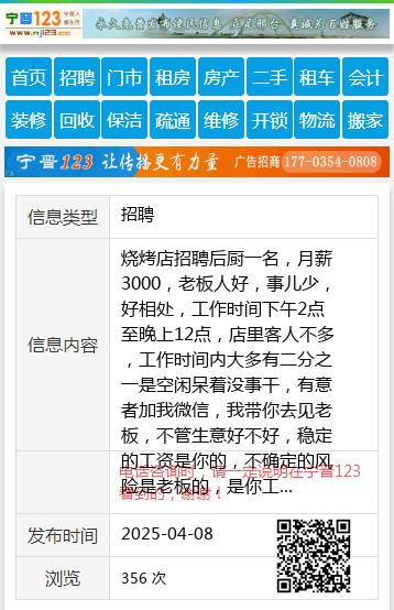 烧烤店招聘后厨一名,月薪3000,老板人好,事儿少,好相处,工作时间下午2点至晚上12点,店里客人不多,工作时间内大多有二分之一是空闲呆着没事干,有意者加我微信,我带你去见老板,不管生意好不好,稳定的工资是你的,不确定的风险是老板的,是你工作的不错的选择,希望朋友圈的好友,帮我转发,联系电话13945890257谢13945890257 |